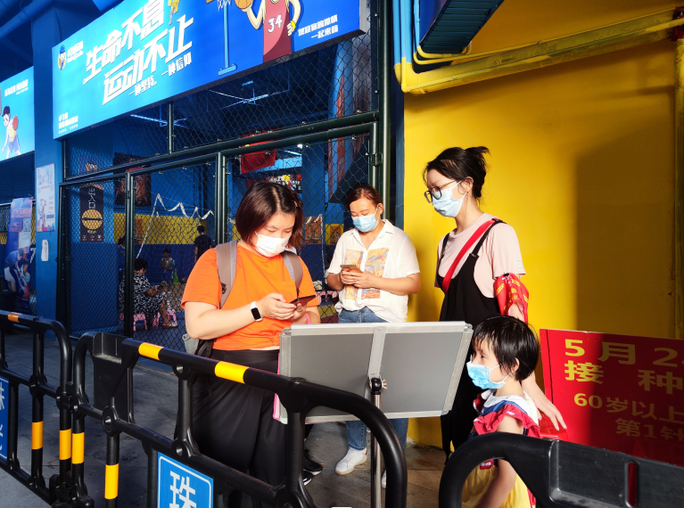 第一道關卡,嚴防死守,要求進店顧客握牢防疫“三板斧”:佩戴口罩、測體溫、掃場所碼。