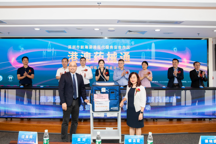 當天,在前海蛇口自貿(mào)區(qū)醫(yī)院,區(qū)委衛(wèi)生工委專職副書記兼紀委書記、區(qū)衛(wèi)生健康局黨組成員張浩主持舉行了“港澳藥械通”落地暨首藥臨床使用啟動儀式。前海合作區(qū)黨工委副書記梁珂,南山區(qū)副區(qū)長蔡淡宏,深圳市衛(wèi)健委醫(yī)政醫(yī)管處二級調(diào)研員莊展輝,深圳市市場監(jiān)管局及南山局,香港中文大學(深圳)醫(yī)學院,市、區(qū)人大代表,華潤廣東醫(yī)藥有限公司,大灣區(qū)醫(yī)療集團、市區(qū)部分醫(yī)院等相關(guān)領(lǐng)導以及香港蛇口同鄉(xiāng)會代表出席了此次儀式,共同見證前海合作區(qū)內(nèi)首批“港澳藥械通”獲批藥品英克西蘭、阿培利司的交接。