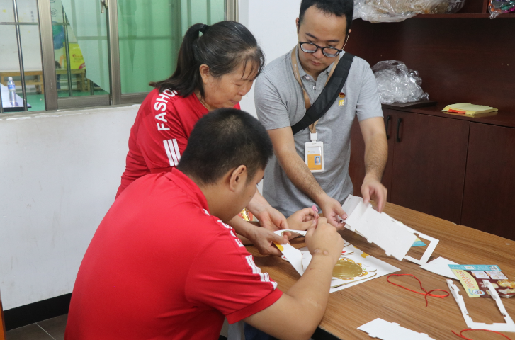 活動當(dāng)天,華潤中山醫(yī)藥一行人在香山古城綜合服務(wù)中心人員的帶領(lǐng)下,前往中山德潤護(hù)理服務(wù)機構(gòu)。在機構(gòu)老師的引領(lǐng)下,參觀了教育機構(gòu)的整體環(huán)境,觀摩他們的教學(xué)情景,了解他們?nèi)粘I攀成钋闆r。隨后,大家共同坐下進(jìn)行溝通交流。通過交談,了解到龍鶯女老師和搭檔張羽春機緣巧合之下共同成立了這所民間公益機構(gòu),致力于幫助從特殊教育學(xué)校畢業(yè)后無處就業(yè)的大齡孩子。在這里,他們給孩子們傳授一定的生活技能以及進(jìn)行康復(fù)治療。并通過手工課程、娛樂運動逐步引導(dǎo)他們,給予他們無限的溫暖與關(guān)愛。龍鶯女老師的優(yōu)秀事跡得到社會認(rèn)可,獲評2022年第二季度“中山好人”。