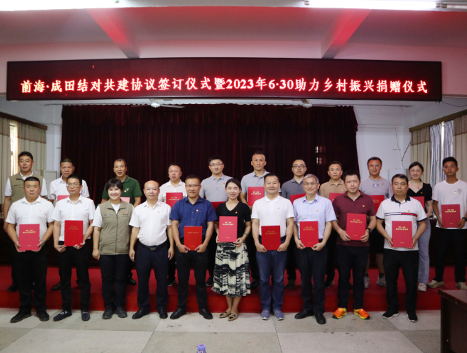2023年9月9日,前海合作區(qū)黨工委組織委屬黨組織赴成田鎮(zhèn)調(diào)研對(duì)口幫扶協(xié)作工作,舉行了“前?!こ商锝Y(jié)對(duì)共建協(xié)議簽訂儀式暨2023年6·30助力鄉(xiāng)村振興捐贈(zèng)儀式”,正式簽署結(jié)對(duì)共建協(xié)議、開(kāi)展聯(lián)學(xué)共建活動(dòng)。前海管理局組織人事部、規(guī)劃管理處、建設(shè)管理處,前海企業(yè)和人才服務(wù)中心及相關(guān)企業(yè)代表等相關(guān)負(fù)責(zé)同志參與調(diào)研、開(kāi)展黨性教育,成田鎮(zhèn)相關(guān)負(fù)責(zé)同志陪同。華潤(rùn)深圳醫(yī)藥有限公司(以下簡(jiǎn)稱(chēng)“華潤(rùn)深圳醫(yī)藥”)相關(guān)負(fù)責(zé)同志參與調(diào)研,并開(kāi)展黨性教育。