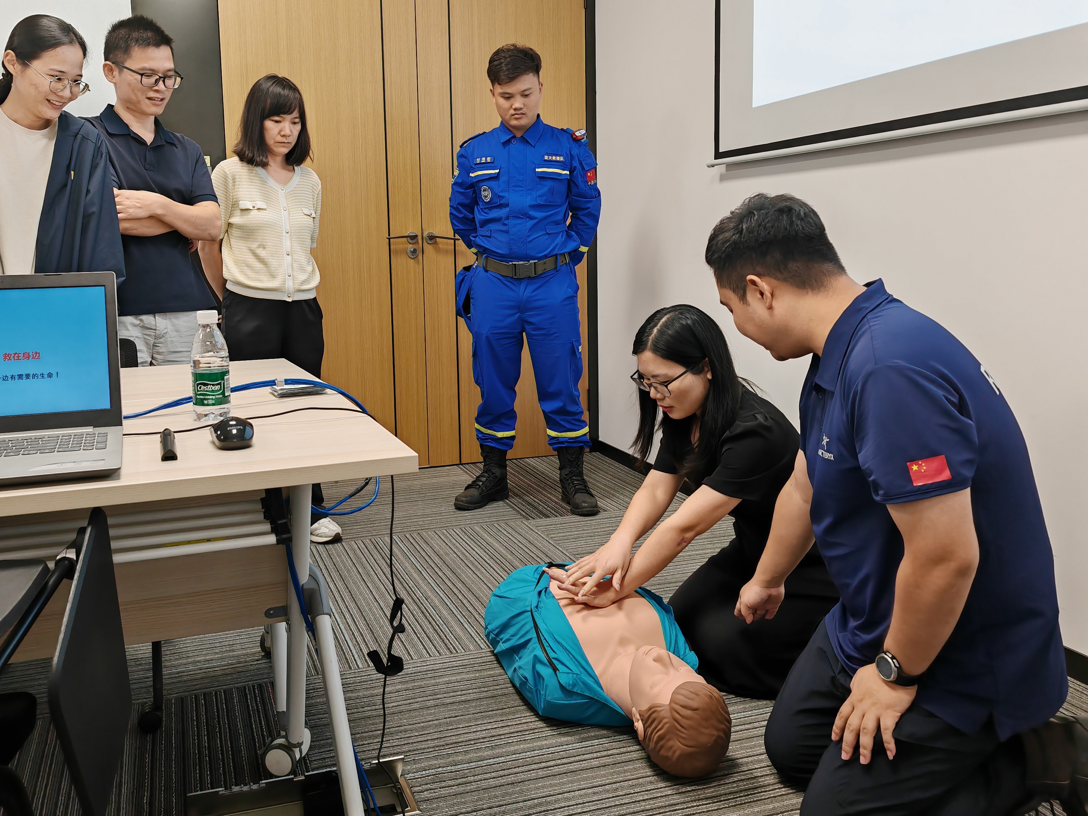 此次培訓由藍天救援隊毛成講師主講,4名救援隊員協(xié)助實操教學。培訓主要圍繞火災逃生、心肺復蘇、海姆立克急救法三個主題展開。毛老師通過專業(yè)知識講授、實際案例分析、動手實操演練等形式多樣、內(nèi)容豐富的授課向大家詳細講解了滅火器的使用、徒手心肺復蘇操作步驟、AED的使用、應急止血包扎方法及海姆立克急救方法,反復強調(diào)了應急救護“黃金四分鐘”的重要性。為了讓大家更加直觀掌握應急救護要領(lǐng),老師邀請大家分組實操心肺復蘇胸外按壓及海姆立克急救法。