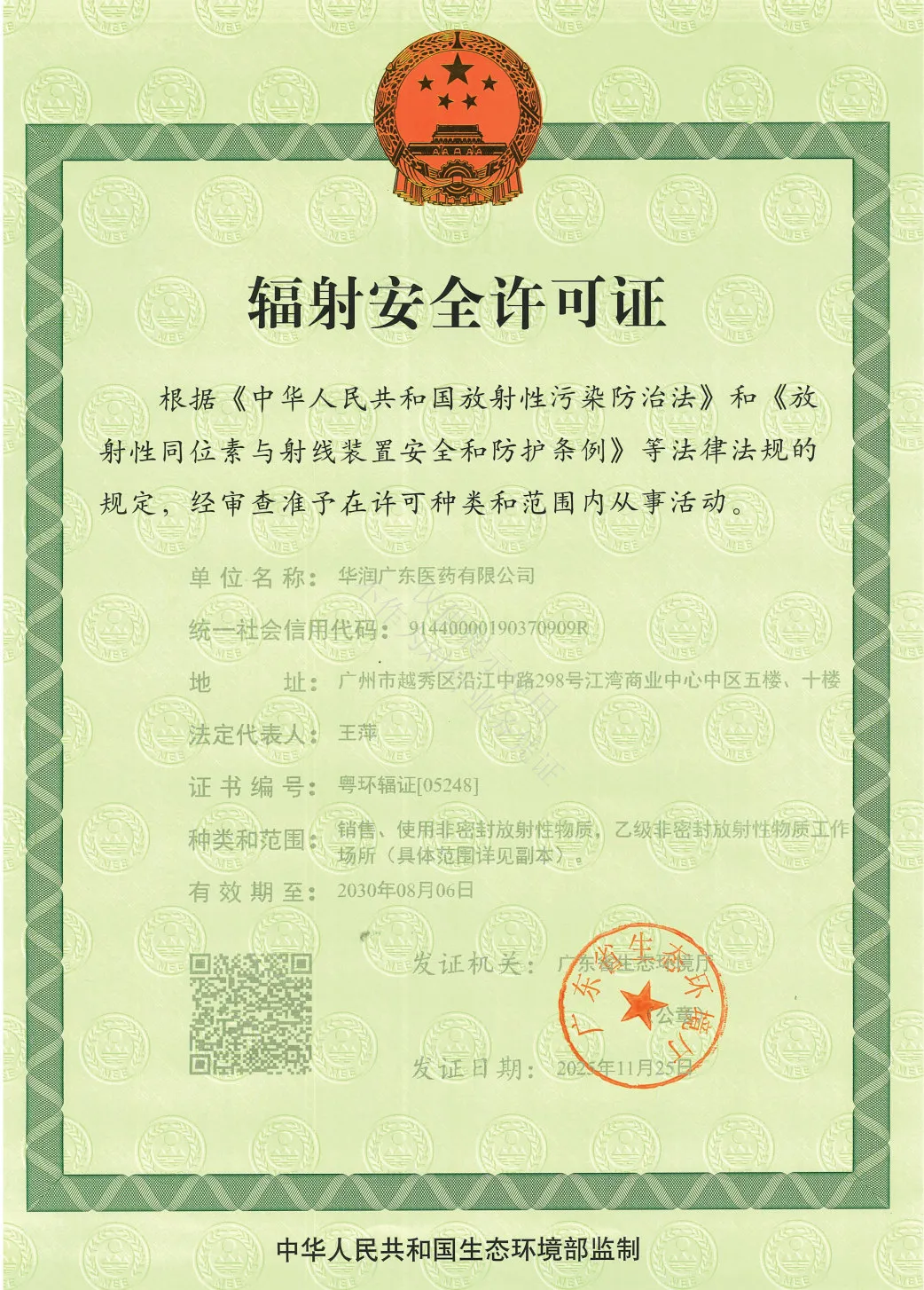 8月7日,華潤廣東醫(yī)藥首次取得輻射安全許可證;11月25日華潤廣東醫(yī)藥完成核素種類與數(shù)量的增項(xiàng)許可?,F(xiàn)階段,華潤廣東醫(yī)藥已構(gòu)建起涵蓋镥-177、釔-90、碘-125等10種放射性核素的合規(guī)經(jīng)營體系。這張?jiān)S可證不僅是公司合法經(jīng)營的“準(zhǔn)入憑證”,更是響應(yīng)國家戰(zhàn)略、踐行環(huán)境健康安全使命的“責(zé)任狀”。