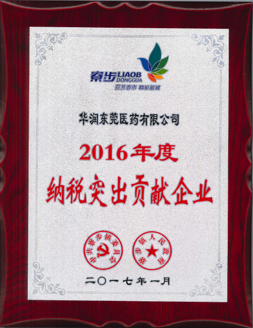 2017年1月17日,東莞市寮步鎮(zhèn)政府召開(kāi)“寮步鎮(zhèn)2016年度工作總結(jié)大會(huì)”,表彰2016年度先進(jìn)工作單位。華潤(rùn)東莞醫(yī)藥有限公司(以下簡(jiǎn)稱(chēng)“華潤(rùn)東莞醫(yī)藥”)榮獲“2016年度納稅突出貢獻(xiàn)企業(yè)”稱(chēng)號(hào)。