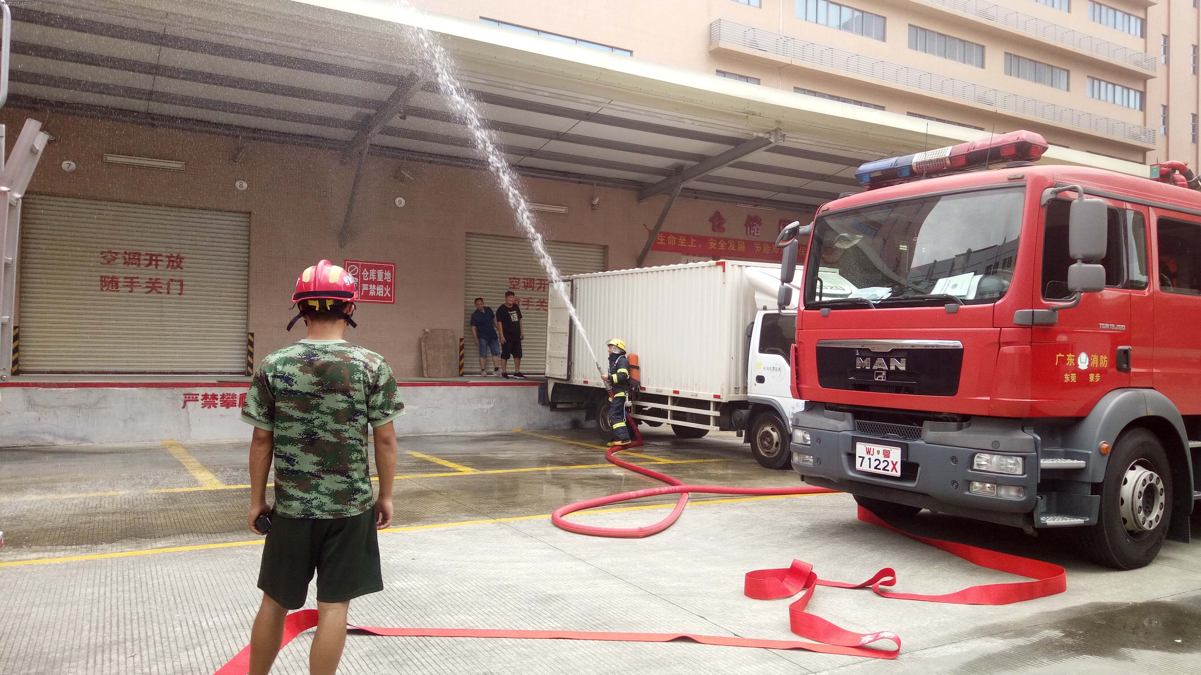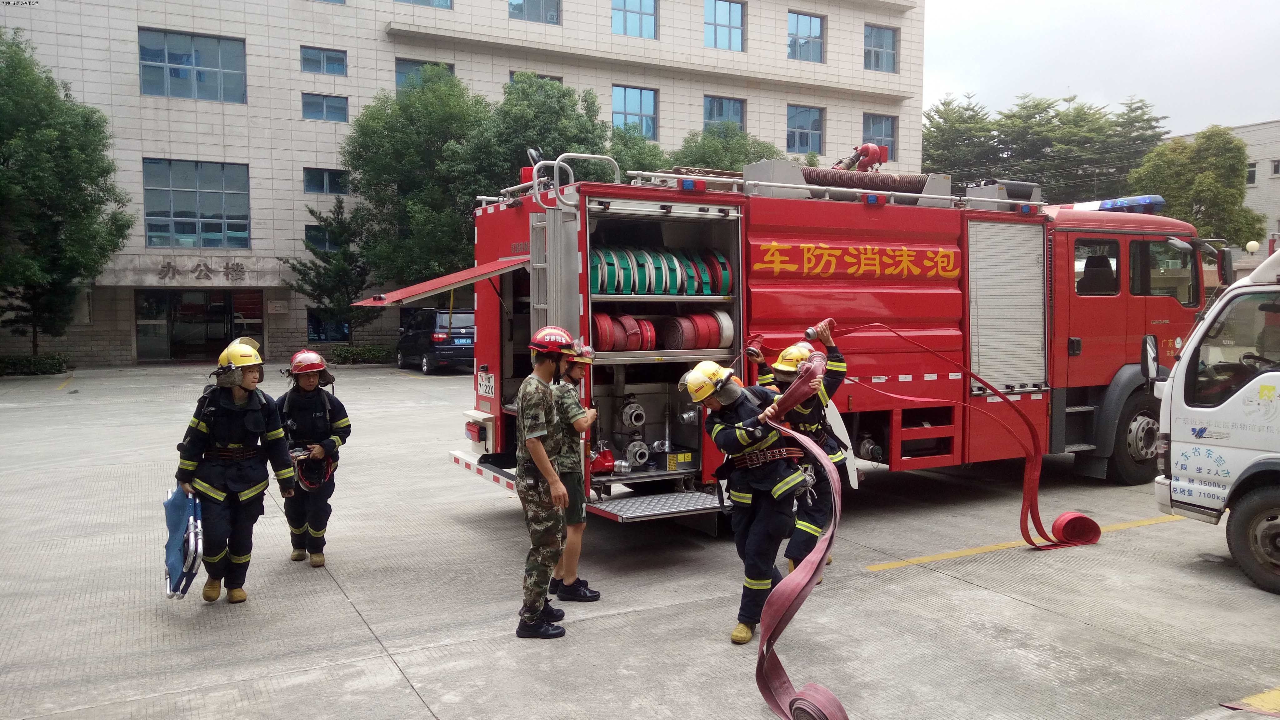 本次演練主要是模擬物流管理中心一樓發(fā)生較大“火情”,一名“受困”人員馬上向企業(yè)消防安全應(yīng)急工作小組求救,并撥打火警“119”求助。接到“火情”后,消防安全應(yīng)急工作小組人員馬上換上防火服裝帶著滅火器迅速趕到起火處,組織人員疏散,并利用最靠近火場的消防栓展開初期撲救。接警后,寮步消防大隊(duì)派出三輛消防車迅速趕到現(xiàn)場展開滅火救援,在消防大隊(duì)消防員和華潤東莞醫(yī)藥消防安全應(yīng)急工作小組成員的合力下,成功救出“受困”人員并轉(zhuǎn)移至安全的地方,徹底撲滅火源。