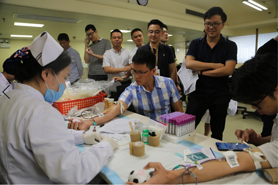 當(dāng)天上午,廣州血液中心的醫(yī)務(wù)人員提前攜帶設(shè)備和物資到達(dá)公司,為即將開始的獻(xiàn)血活動(dòng)做好準(zhǔn)備工作。上午9點(diǎn),隨著同事們的陸續(xù)到來(lái),獻(xiàn)血活動(dòng)正式拉開帷幕。第一位進(jìn)行獻(xiàn)血的是一位女士。在第一個(gè)采血點(diǎn),她配合醫(yī)師進(jìn)行信息登記和健康情況的征詢,然后接受取微量血進(jìn)行血液檢測(cè)。接著稍作休息,等候結(jié)果。通過(guò)血液檢測(cè)后,她便到第二個(gè)采血點(diǎn)進(jìn)行正式的血液采集。第一位獻(xiàn)血者全程從容不迫,仔細(xì)觀察還帶著淡淡的微笑。在她之后,同事們也紛紛有序地參與到活動(dòng)中去。獻(xiàn)血活動(dòng)的主力軍,依舊是意氣風(fēng)發(fā)的青年同志們。友愛與信任在他們的互相鼓勵(lì)之中凝聚,無(wú)私奉獻(xiàn)的愛透過(guò)他們的實(shí)際行動(dòng)去傳播,而責(zé)任感與擔(dān)當(dāng)也在他們之間繼續(xù)傳承著。