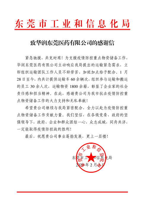 這封感謝信來自東莞市工業(yè)和信息化局,傳遞了東莞市工業(yè)和信息化局對(duì)華潤(rùn)東莞醫(yī)藥提供高效、積極及專業(yè)的物流配送的感謝,也鼓舞了華潤(rùn)東莞醫(yī)藥此刻為疫情應(yīng)急物資運(yùn)輸工作努力奮戰(zhàn)的團(tuán)隊(duì)信心。