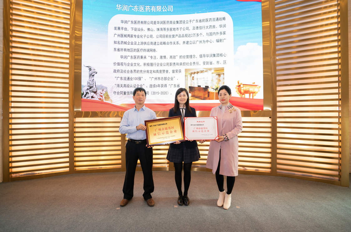 2021年11月25日,廣州市越秀區(qū)2021年度“誠信示范企業(yè)”及“誠信示范樓宇”授牌儀式在珠江國際大廈隆重舉行。廣州市信用辦、越秀區(qū)信用辦、越秀區(qū)商務(wù)局、越秀區(qū)市場監(jiān)督局、廣東省信用協(xié)會等單位領(lǐng)導(dǎo)分別為獲批企業(yè)和樓宇頒發(fā)牌匾和證書。華潤廣東醫(yī)藥有限公司(以下簡稱:華潤廣東醫(yī)藥)榮獲“廣州市越秀區(qū)誠信示范企業(yè)”榮譽。
