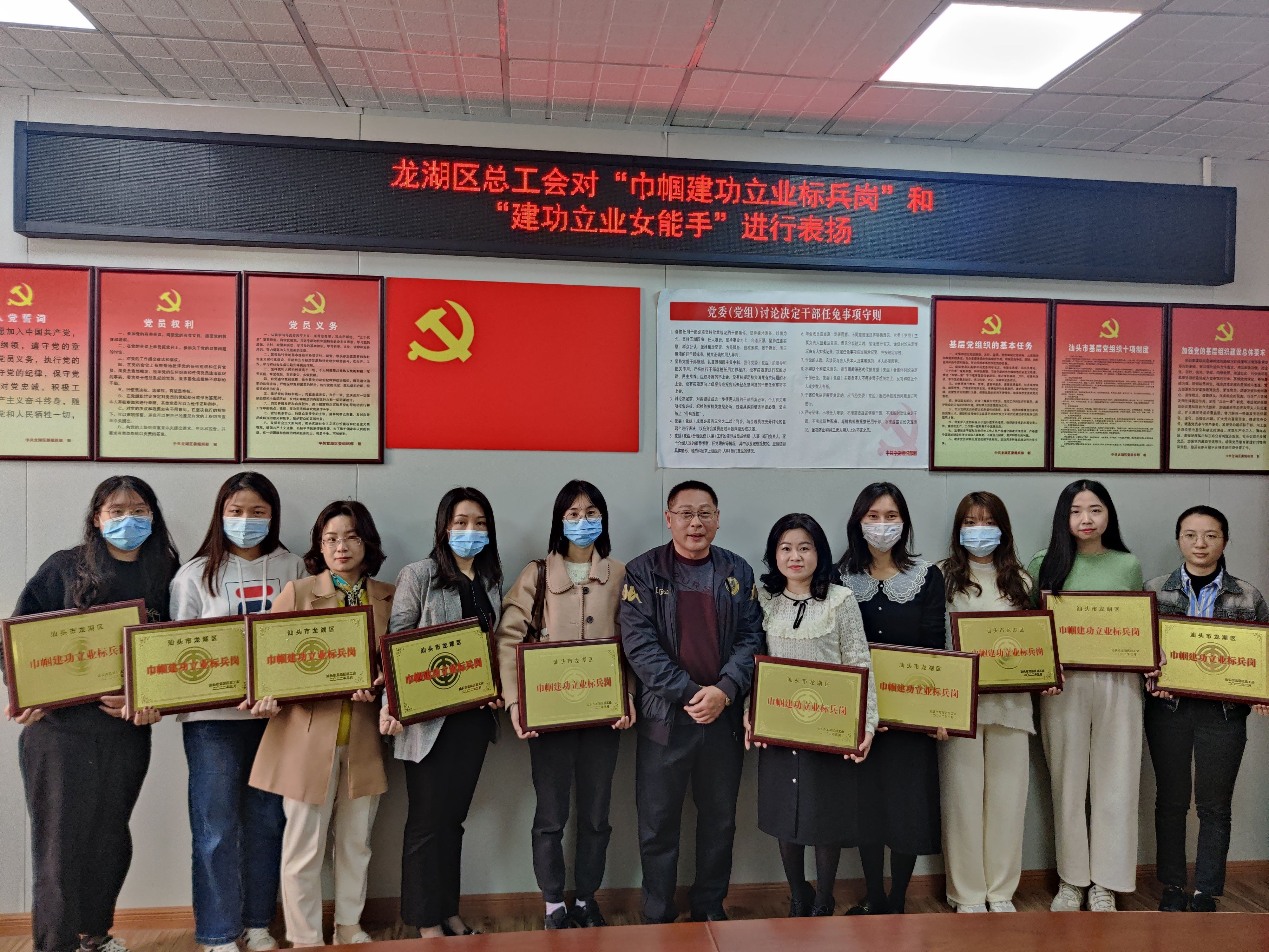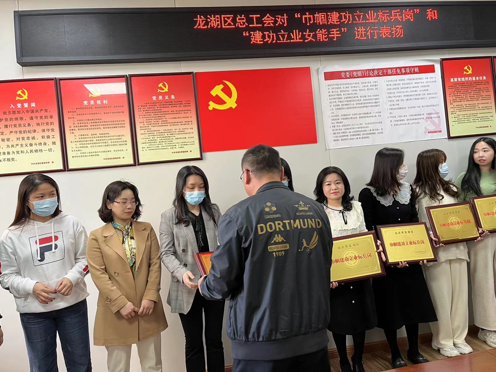 2022年3月7日,汕頭市龍湖區(qū)總工會對被評為“巾幗建功立業(yè)標(biāo)兵崗”和“建功立業(yè)女能手”的先進(jìn)女職工集體和個人進(jìn)行表揚(yáng),區(qū)人大副主任、總工會主席文琴,區(qū)總工會副主席張海巖為先進(jìn)集體和個人頒發(fā)獎牌和獎狀。文琴對各獲評集體和個人的工作表示肯定,希望受到表揚(yáng)的集體和個人珍惜榮譽(yù),繼續(xù)發(fā)揚(yáng)愛崗敬業(yè)、勤于創(chuàng)造、甘于奉獻(xiàn)、爭創(chuàng)一流的精神,帶動身邊更多人為新時代經(jīng)濟(jì)特區(qū)建設(shè)作出貢獻(xiàn)。